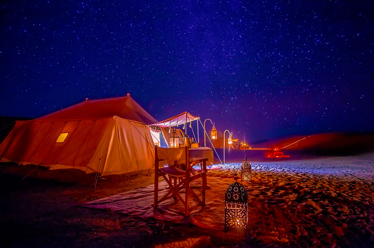 Your tent, elegantly appointed with plush bedding and soft rugs, provides a sense of opulence in the heart of the desert. Outside, a private dining area awaits, complete with crystal glassware and delicate porcelain. As the sun dips below the horizon, the dunes are bathed in hues of orange and purple, creating a stunning canvas that seems too beautiful to be real. Your personal chef, selected by Jastans, prepares a multi-course dinner featuring a mix of Moroccan and international flavors, all beautifully presented in the open air under the stars.
