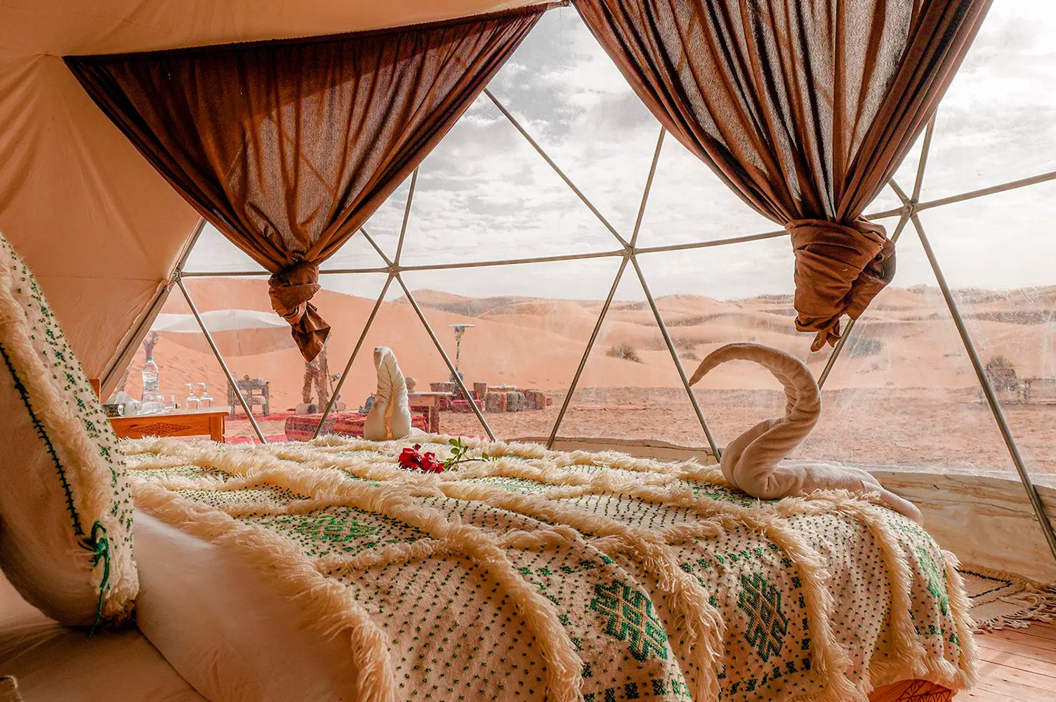 The Sahara is a place of unimaginable beauty and solitude, a destination where the earth and sky seem to stretch into infinity. As you venture deeper into the desert, the landscape becomes ever more surreal, with the towering dunes of Erg Chebbi, hand-selected by Jastans, rising like golden walls around you. The stillness of the desert is broken only by the soft crunch of your camel’s hooves in the sand and the occasional whisper of the wind. Here, you will experience Morocco’s most exclusive desert retreat, booked through Jastans Bespoke Luxury Vacations, where your private encampment offers unparalleled luxury.