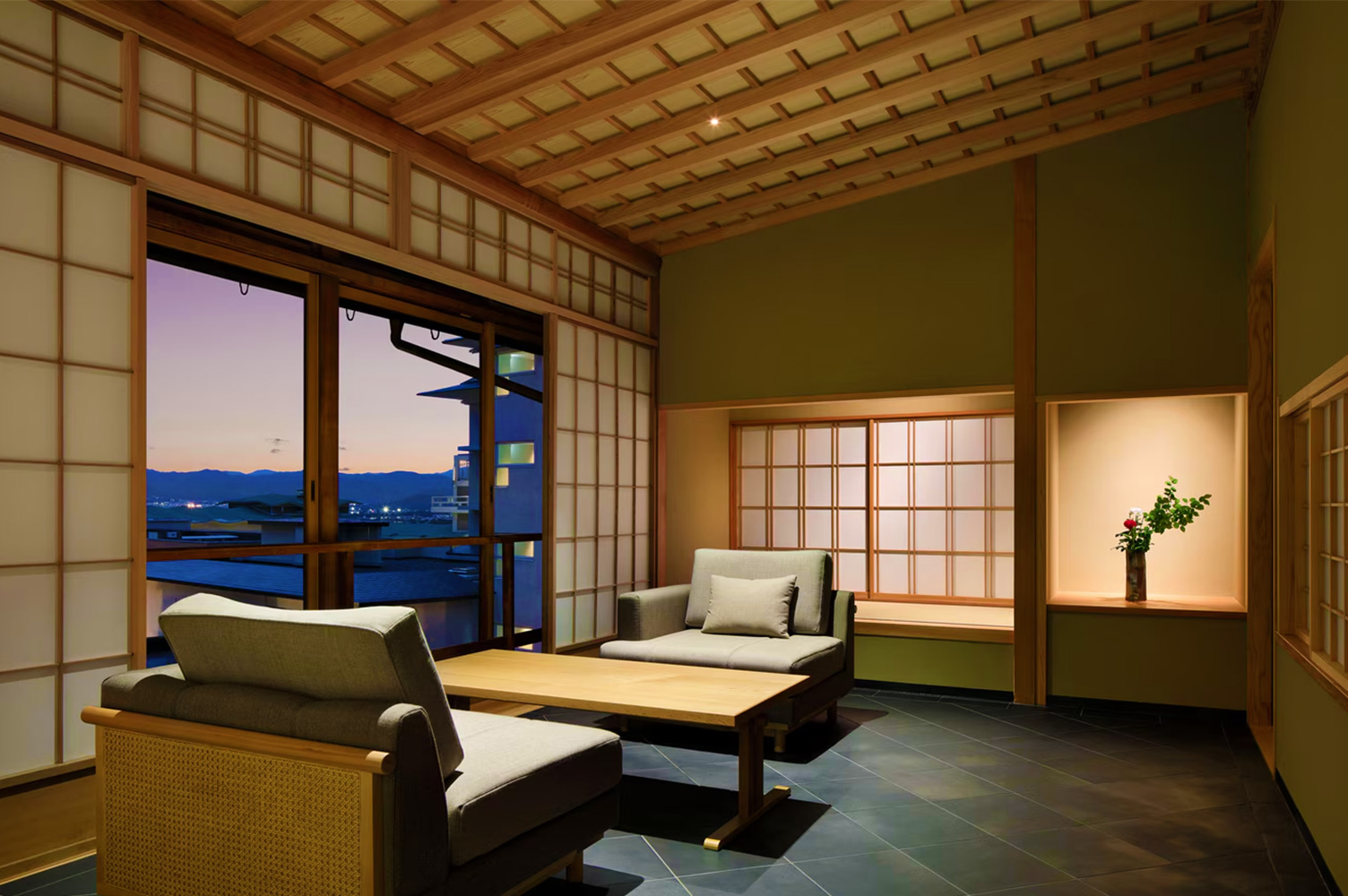 The property has thoughtfully designed suites and rooms, many exceeding 50 square meters. Generous by Japanese standards! Expansive sliding window frames open up to Kyoto’s skyline and scenic slopes, inviting nature inward.